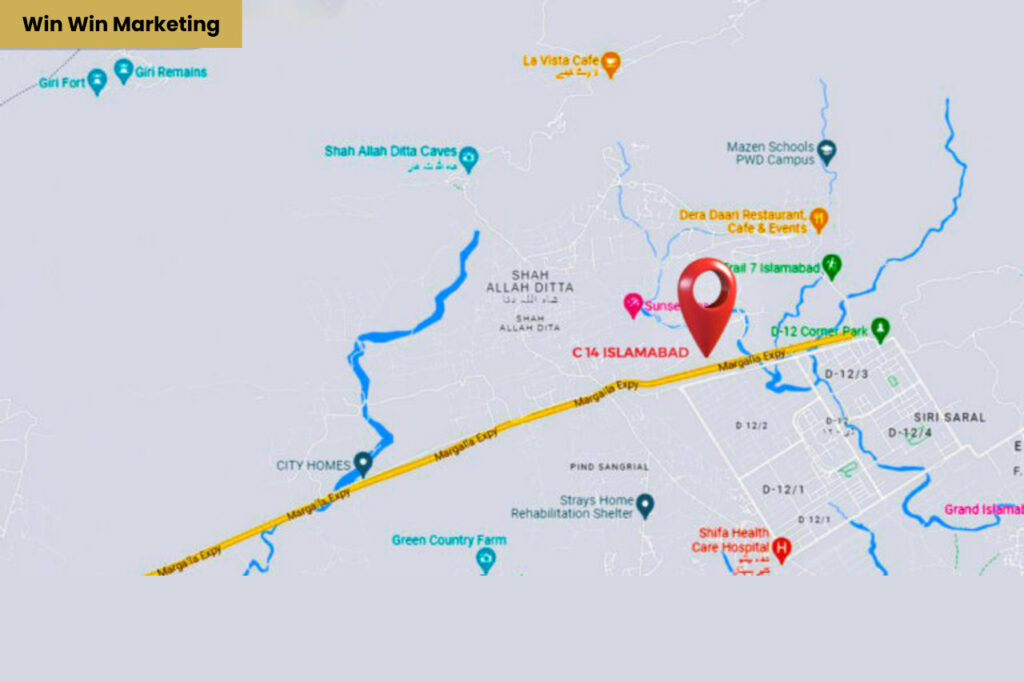 Sector C-14 is also one of the most demanding sectors near the Margalla Hills. CDA has beautifully developed this sector, offering scenic views and convenient living. It is accessible through sector D-12. It’s approximately 20 kilometers from zero point and 38 kilometers from Islamabad International Airport. The master plan includes road construction and features 1 Kanal residential plot. The commercial area, C-14 main Markaz, offers various dining and shopping options. The sector boasts modern amenities like schools, colleges, markets, banks, parks, and community halls, making it ideal for a comfortable and convenient lifestyle. C-14 Map is as follows.