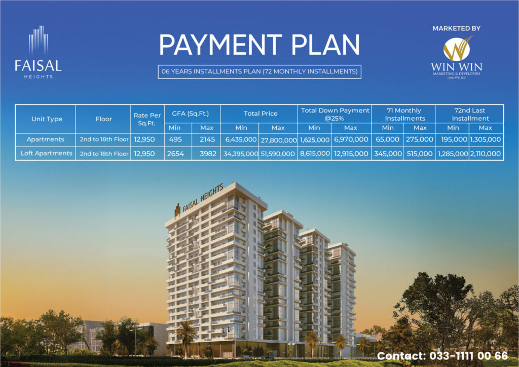 Faisal Heights offers an affordable 6-year (72-month) installment plan, with possession in 5