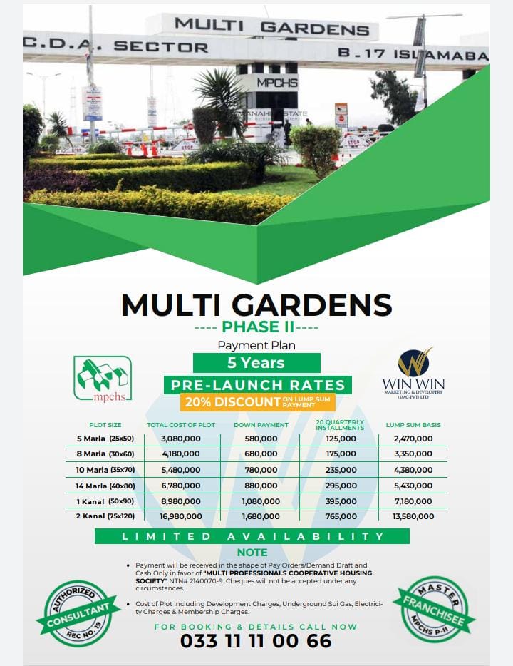 This information will help prospective buyers make informed decisions and explore the available options in Multi Gardens Phase 2. Please keep in mind that prices and terms may be subject to change, so it’s advisable to verify the latest details directly with MPCHS Multi Gardens Phase 2 or through their official channels.